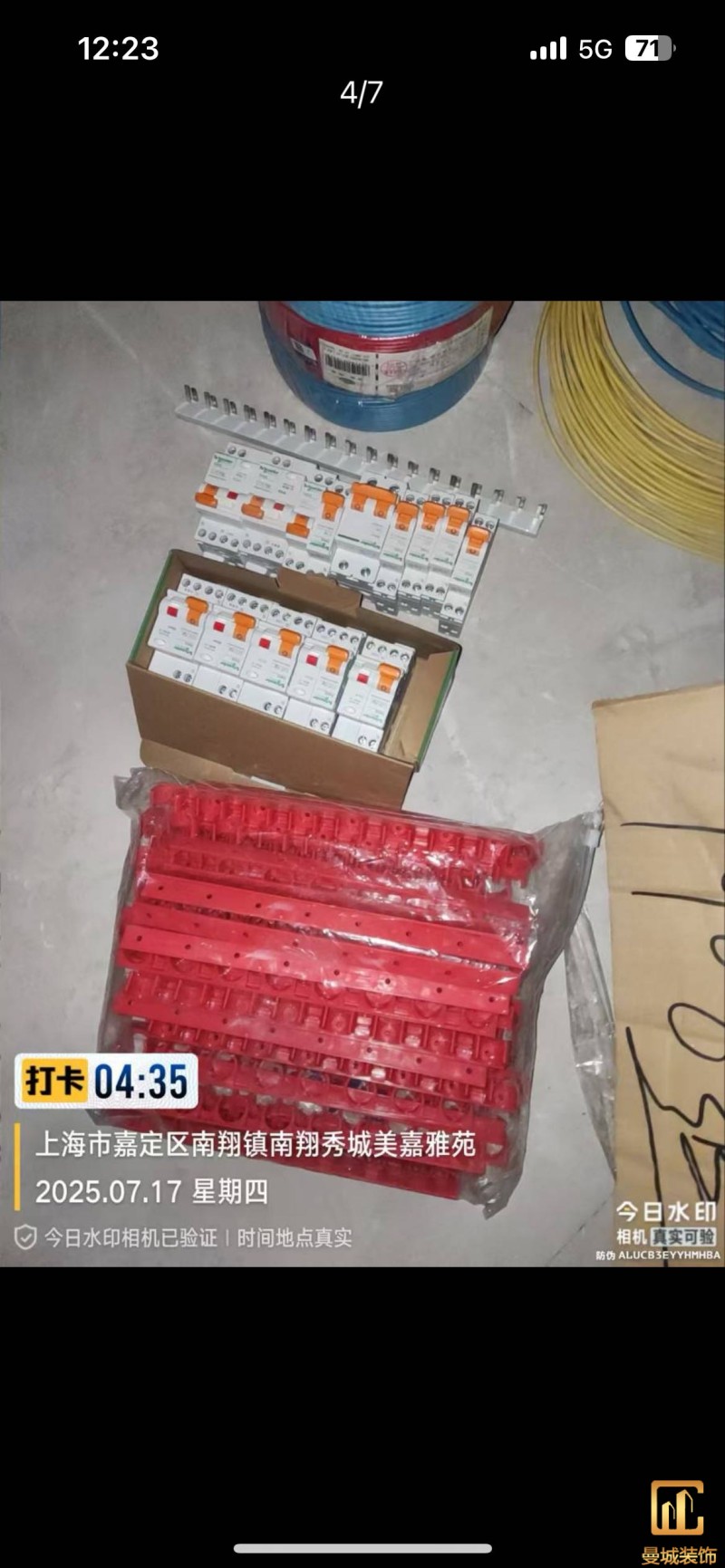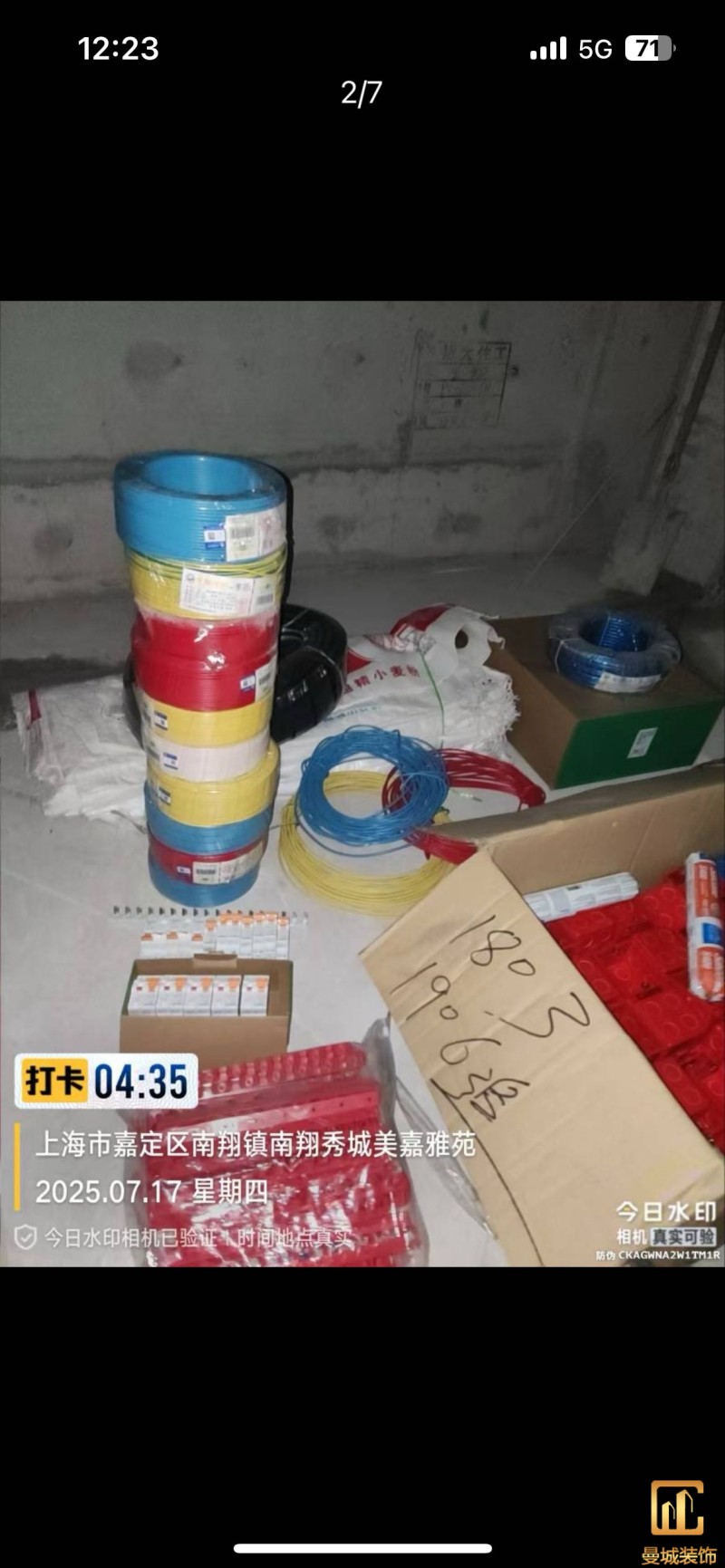 电工已进场施工,电工完工时间预估5个工作是,电线为熊猫、耐克耐。起帆电线1.5数量300米2.5数量为400米,网线超六类康普、熊猫、起帆 线管为中财/保利315中型6分管,按施工要求,厨房进线为4㎡,冰箱单独一路,卫生间进线为4㎡客厅空调为4㎡电线,总线路为11路,分别为 空调4路,厨房2路,卫生间1路,照明1路,房间插座1路,客餐厅1路。开关离地高度1.3米 插座离地35公分,空调插座离地高度2.2米。房间双控开关高度为550-600之间。开关插座总点位为80个。水走顶,电走地,水电不同槽,横槽不超过1米。地面开槽大弧湾工艺,强弱电间距200mm 以上,墙弱电交叉处用专用锡箔做信号屏蔽处理,默认煤气管40PVC管预埋高度离地1350cm。三角阀离地度度1400cm,电视机用50PVC管预埋高度350cm-1100cm 、默认花洒离地高度900-1000cm、马桶三角阀离地度度150-250cm,台盆三角阀离地度度350-400cm,墙排下水离地高度400-500cm,