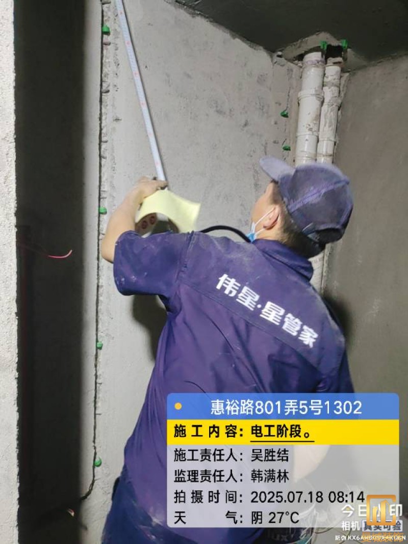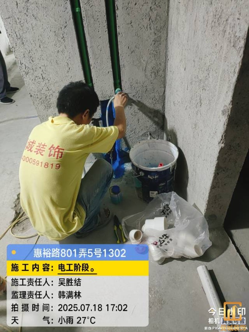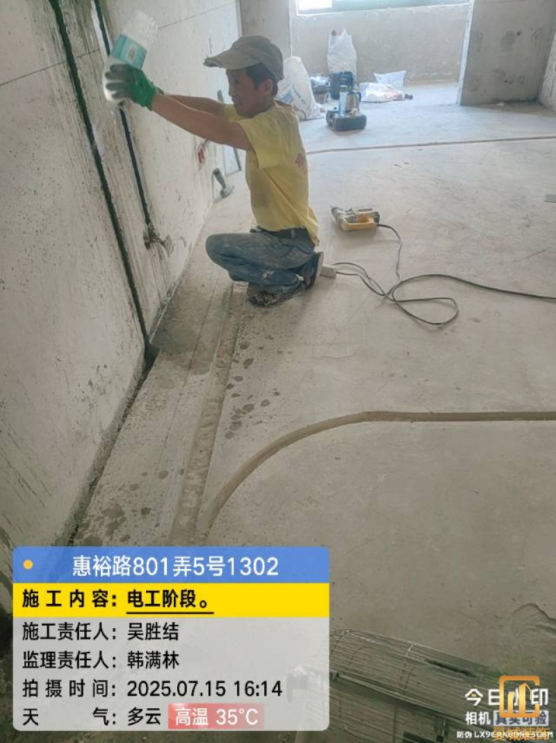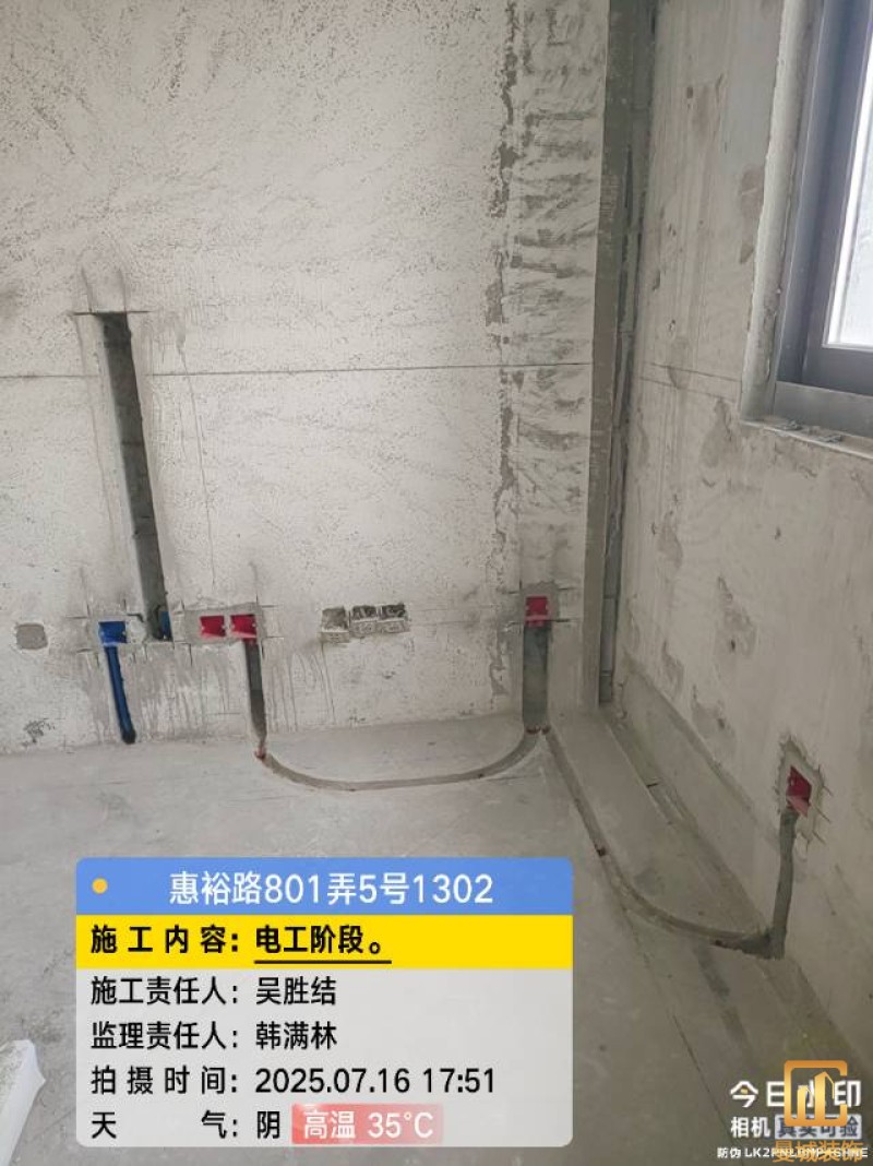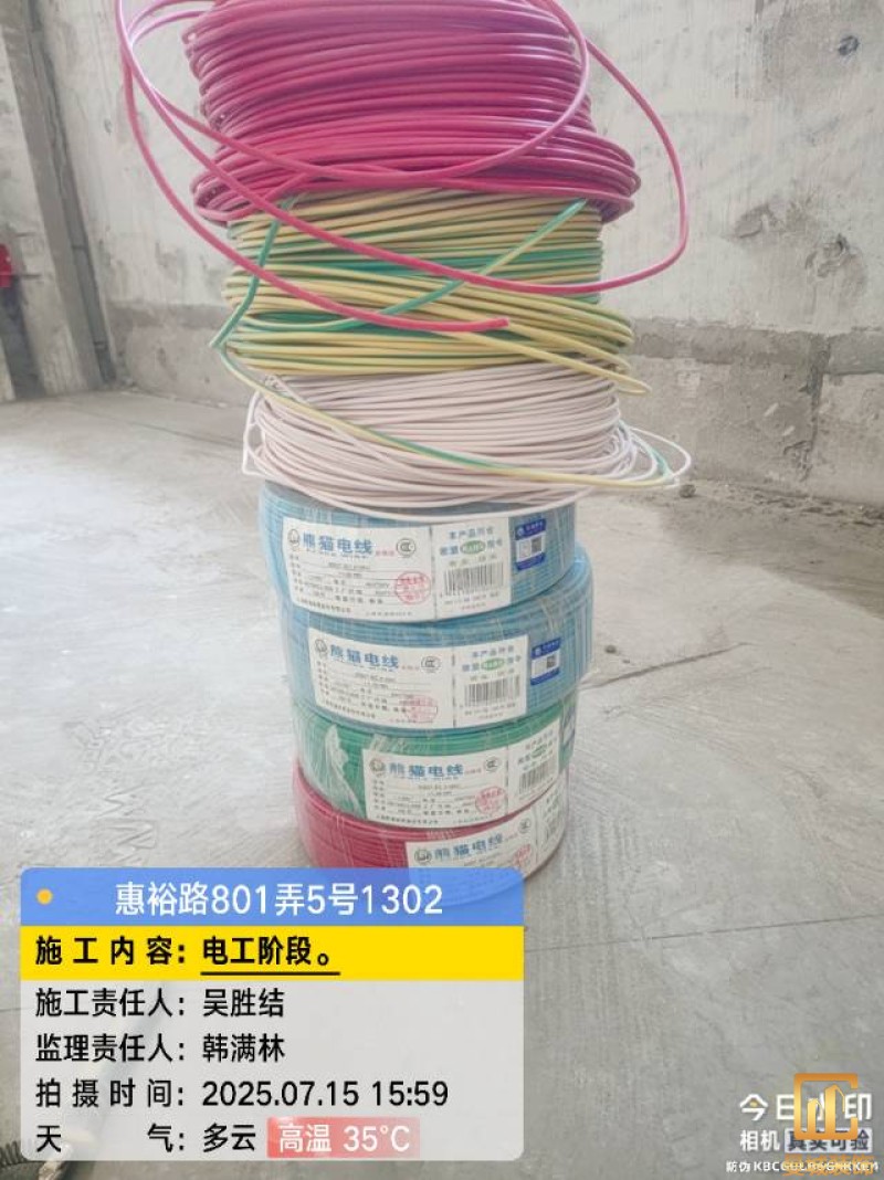 电工已进场施工,电工完工时间预估5个工作是,电线为熊猫、耐克耐。起帆电线1.5数量300米2.5数量为400米,网线超六类康普、熊猫、起帆 线管为中财/保利315中型6分管,按施工要求,厨房进线为4㎡,冰箱单独一路,卫生间进线为4㎡客厅空调为4㎡电线,总线路为11路,分别为 空调4路,厨房2路,卫生间1路,照明1路,房间插座1路,客餐厅1路。开关离地高度1.3米 插座离地35公分,空调插座离地高度2.2米。房间双控开关高度为550-600之间。开关插座总点位为80个。水走顶,电走地,水电不同槽,横槽不超过1米。地面开槽大弧湾工艺,强弱电间距200mm 以上,墙弱电交叉处用专用锡箔做信号屏蔽处理,默认煤气管40PVC管预埋高度离地1350cm。三角阀离地度度1400cm,电视机用50PVC管预埋高度350cm-1100cm 、默认花洒离地高度900-1000cm、马桶三角阀离地度度150-250cm,台盆三角阀离地度度350-400cm,墙排下水离地高度400-500cm,