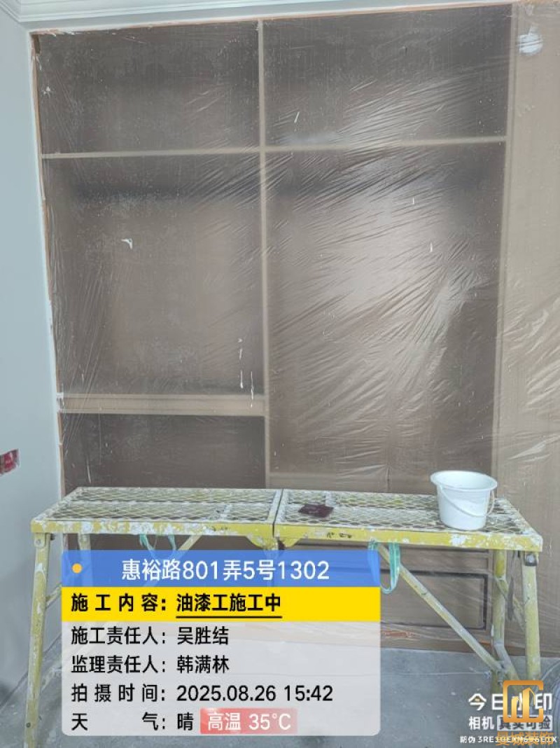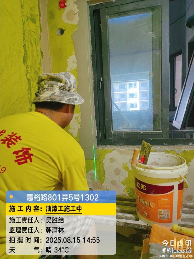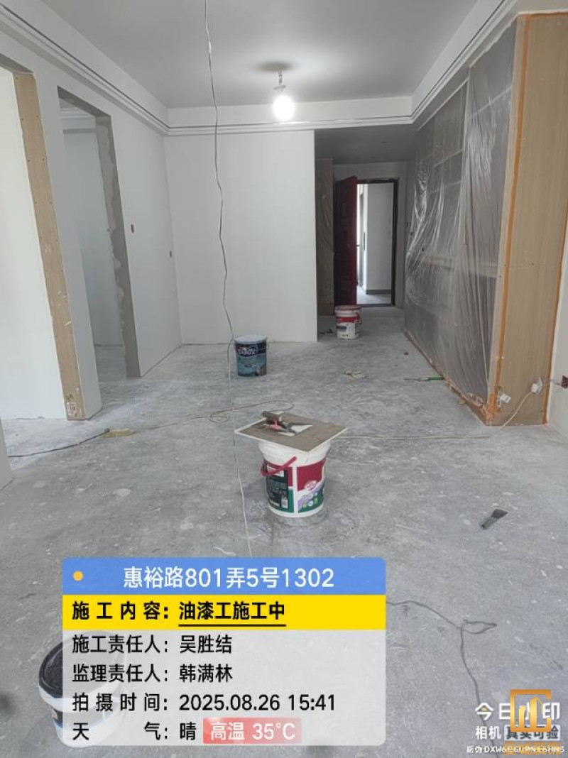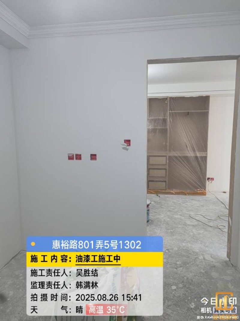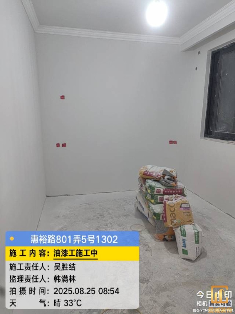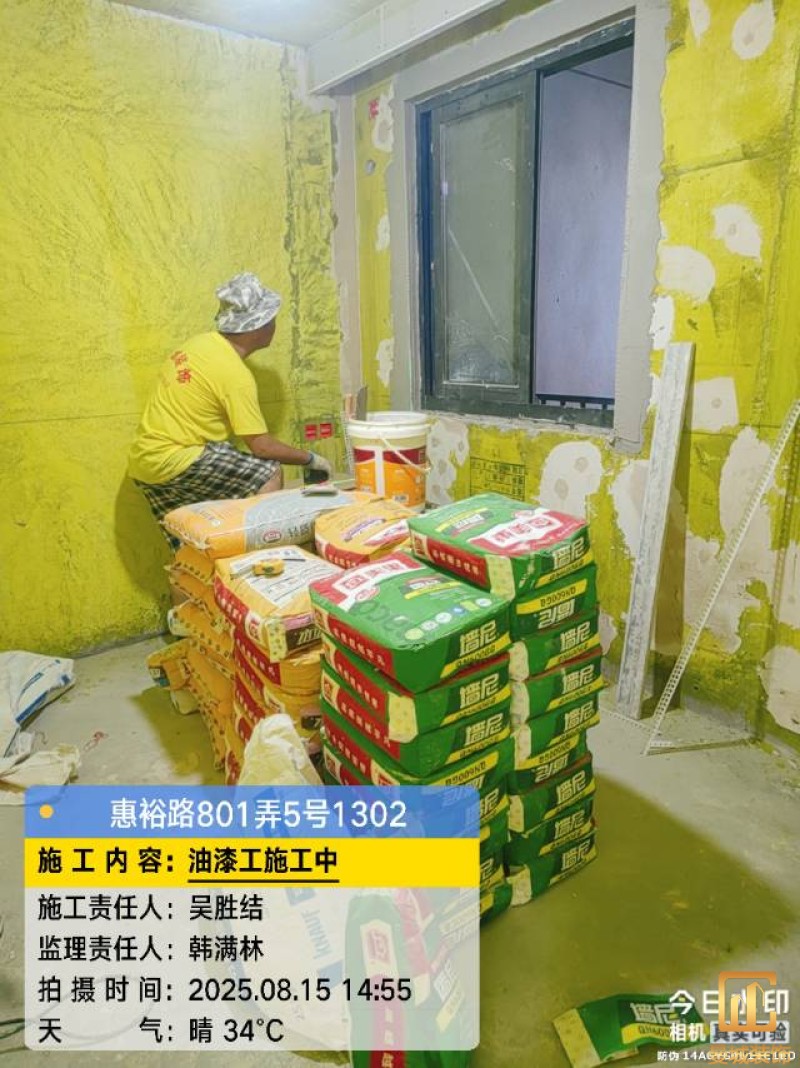 油漆材料已送达现场,安公司要求已摆放在指定区域,1、腻子粉美巢、墙尼美巢、石膏粉美巢、2、腻子粉龙牌、墙尼/找平石膏龙牌、石膏粉龙牌、3、腻子粉诗珑、墙尼/找平石膏诗珑、石膏粉诗珑,4、腻子粉西卡、墙尼/找平石膏西卡、石膏粉西卡。涂料多乐士、立邦 诗珑、左顿 5、找平已用过赶尺一次性批到底、6、门洞、窗口阳角部位使用阳角条已做垂直处理、现场制柜子靠墙70公分两侧已做冲筋垂直垂直误差3mm以内、7、墙面基层墙固已全部刷好,墙固作用墙固优异的渗透性能充分浸润墙体基层材料表面,通过胶联使基层密实,提高界面附着力以及灰浆或腻子和墙体表面的粘接强度,防止腻子粉脱落。8、涂料一底二面,底漆用于提高面漆的附着力、增加面漆的丰满度、提供抗碱性、提供防腐功能。