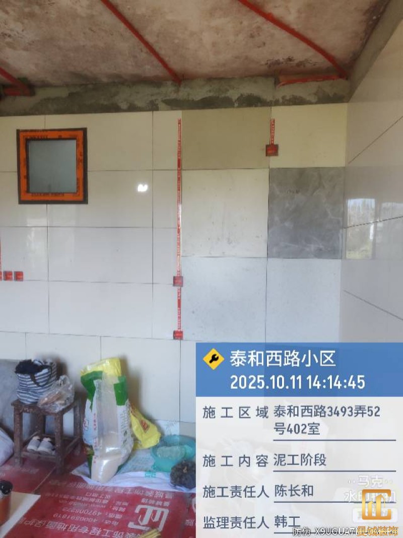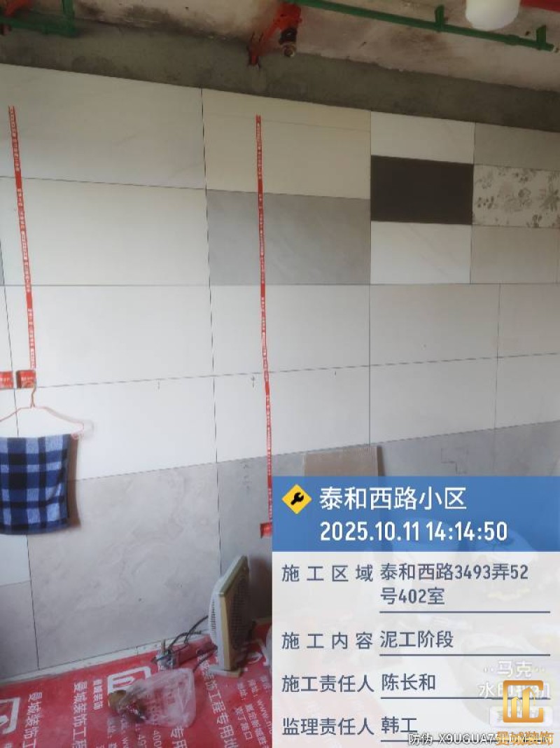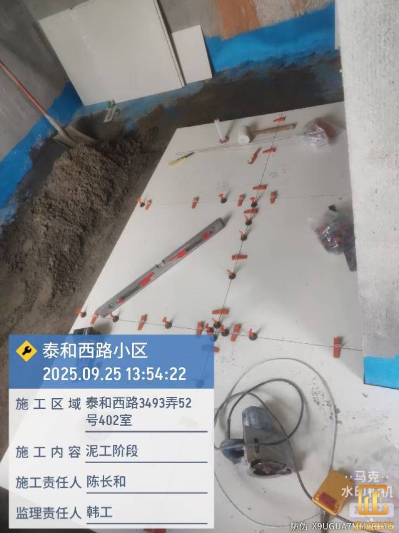 墙面砖与地砖做到墙地对缝,完成后用公司专用标织带进行粘贴标一下,方便后面施工。