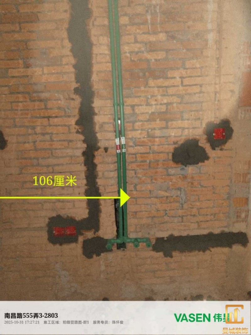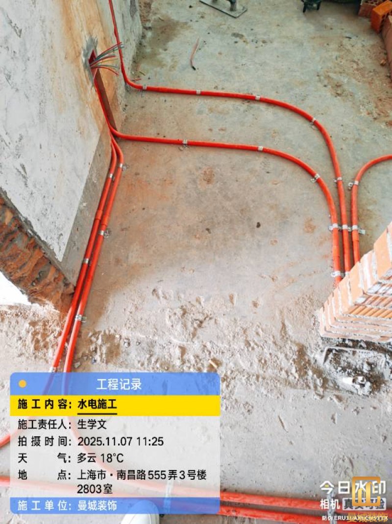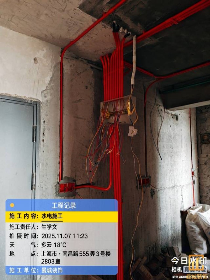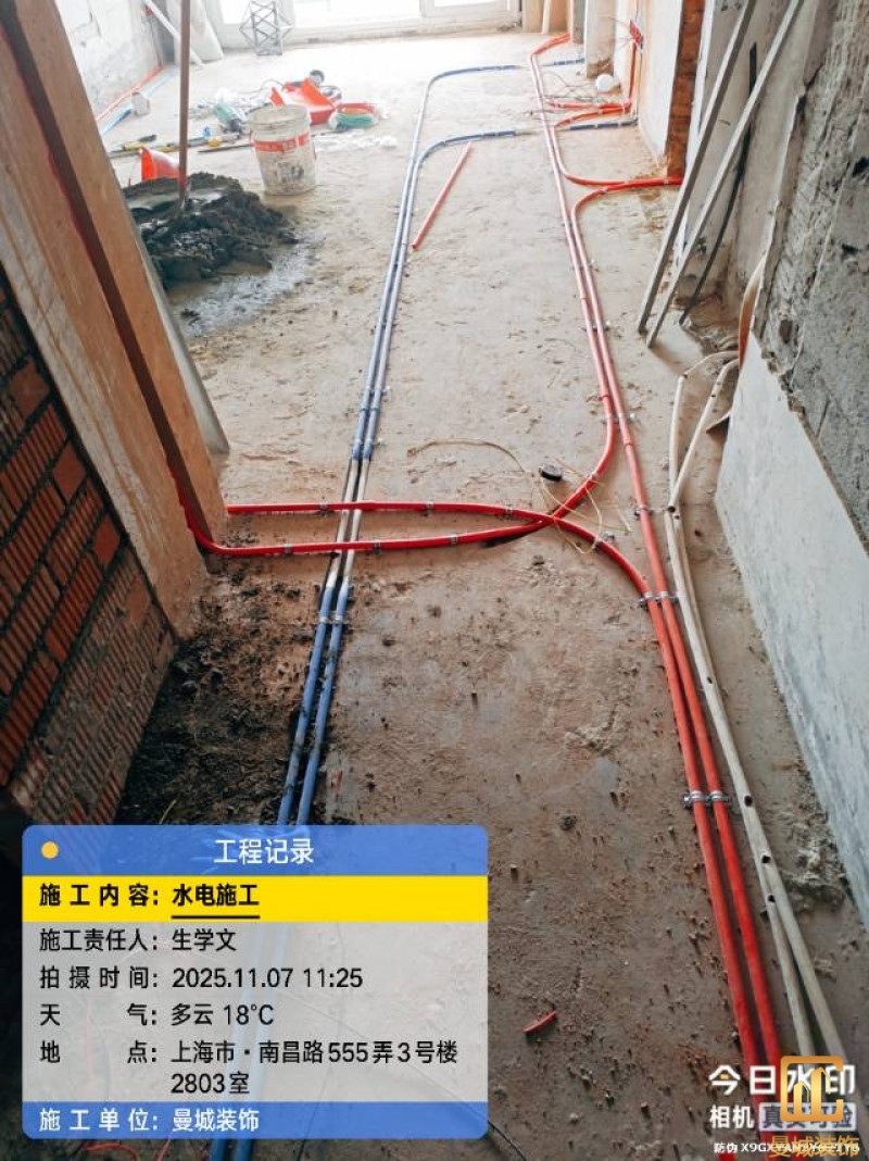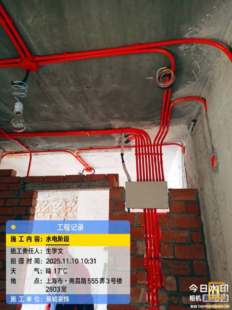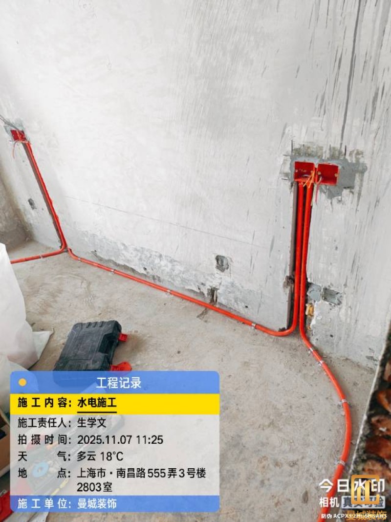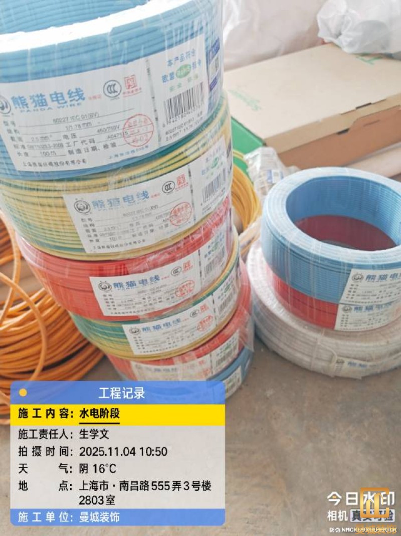 电工已进场施工,电工完工时间预估5个工作是,电线为熊猫、耐克耐。起帆电线1.5数量300米2.5数量为400米,网线超六类康普、熊猫、起帆 线管为中财/保利315中型6分管,按施工要求,厨房进线为4㎡,冰箱单独一路,卫生间进线为4㎡客厅空调为4㎡电线,总线路为11路,分别为 空调4路,厨房2路,卫生间1路,照明1路,房间插座1路,客餐厅1路。开关离地高度1.3米 插座离地35公分,空调插座离地高度2.2米。房间双控开关高度为550-600之间。开关插座总点位为80个。水走顶,电走地,水电不同槽,横槽不超过1米。地面开槽大弧湾工艺,强弱电间距200mm 以上,墙弱电交叉处用专用锡箔做信号屏蔽处理,默认煤气管40PVC管预埋高度离地1350cm。三角阀离地度度1400cm,电视机用50PVC管预埋高度350cm-1100cm 、默认花洒离地高度900-1000cm、马桶三角阀离地度度150-250cm,台盆三角阀离地度度350-400cm,墙排下水离地高度400-500cm,