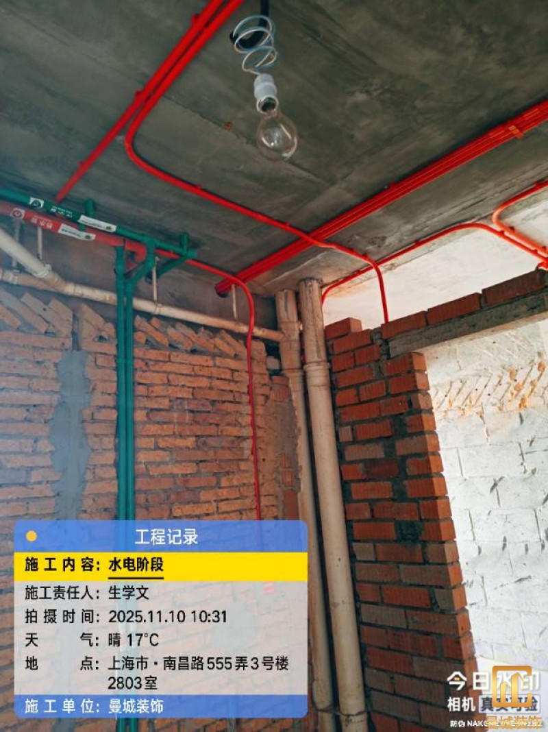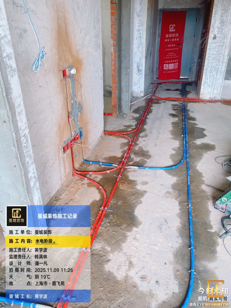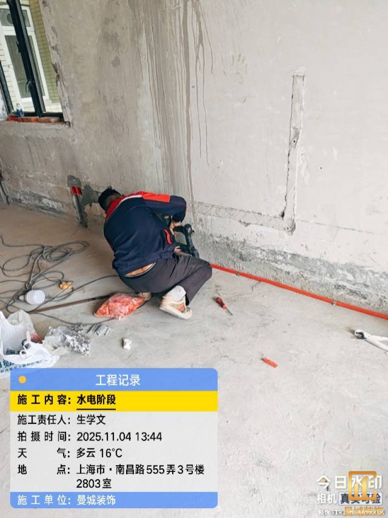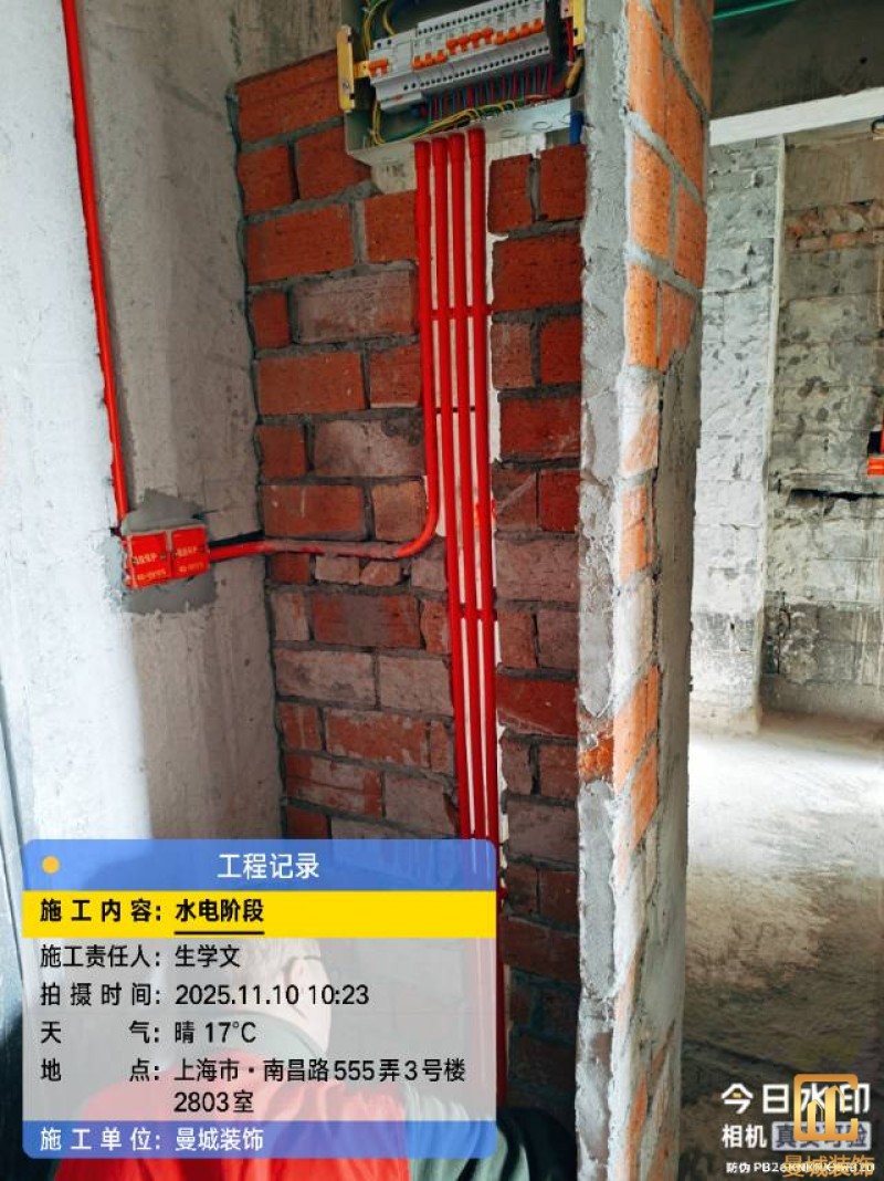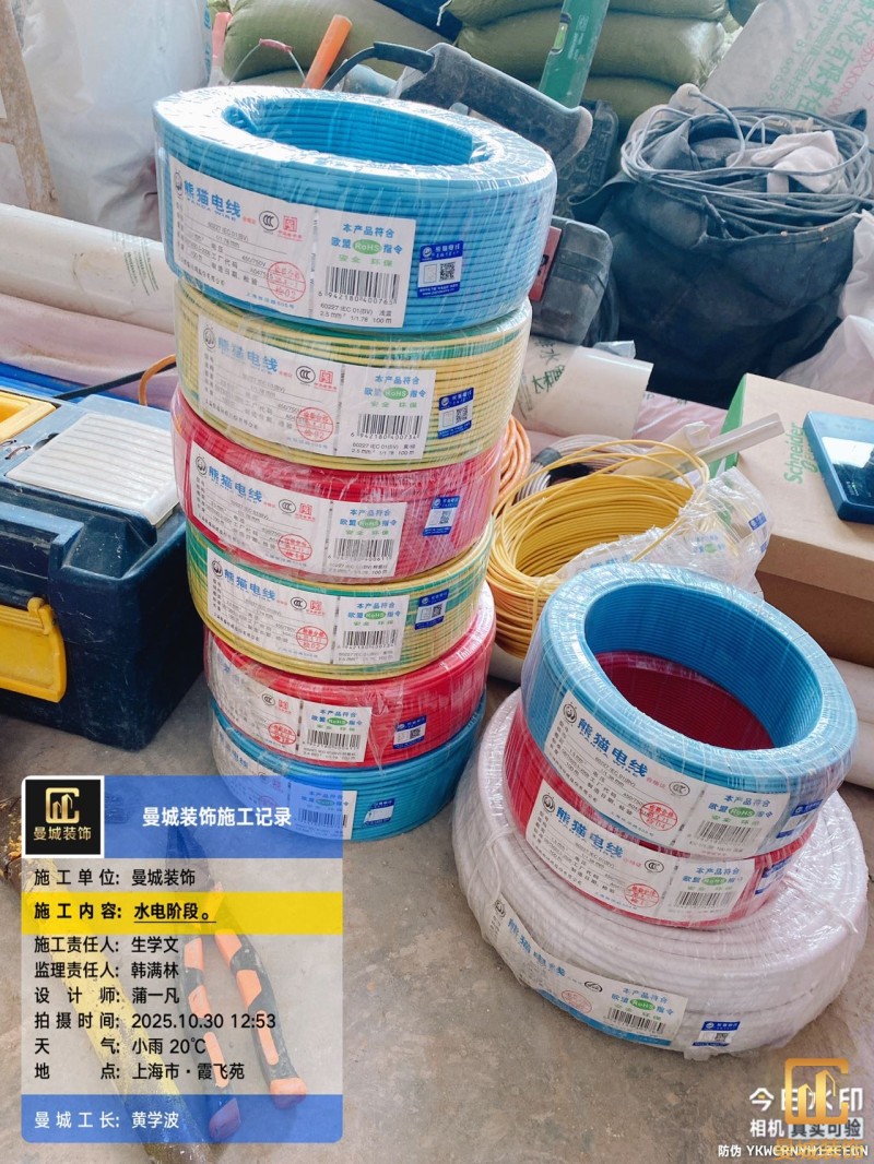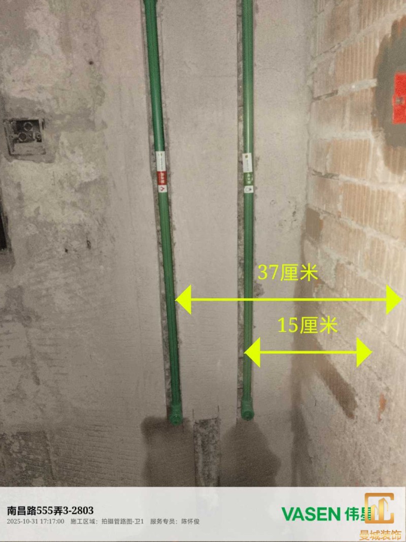 电工已进场施工,电工完工时间预估5个工作是,电线为熊猫、耐克耐。起帆电线1.5数量300米2.5数量为400米,网线超六类康普、熊猫、起帆 线管为中财/保利315中型6分管,按施工要求,厨房进线为4㎡,冰箱单独一路,卫生间进线为4㎡客厅空调为4㎡电线,总线路为11路,分别为 空调4路,厨房2路,卫生间1路,照明1路,房间插座1路,客餐厅1路。开关离地高度1.3米 插座离地35公分,空调插座离地高度2.2米。房间双控开关高度为550-600之间。开关插座总点位为80个。水走顶,电走地,水电不同槽,横槽不超过1米。地面开槽大弧湾工艺,强弱电间距200mm 以上,墙弱电交叉处用专用锡箔做信号屏蔽处理,默认煤气管40PVC管预埋高度离地1350cm。三角阀离地度度1400cm,电视机用50PVC管预埋高度350cm-1100cm 、默认花洒离地高度900-1000cm、马桶三角阀离地度度150-250cm,台盆三角阀离地度度350-400cm,墙排下水离地高度400-500cm,